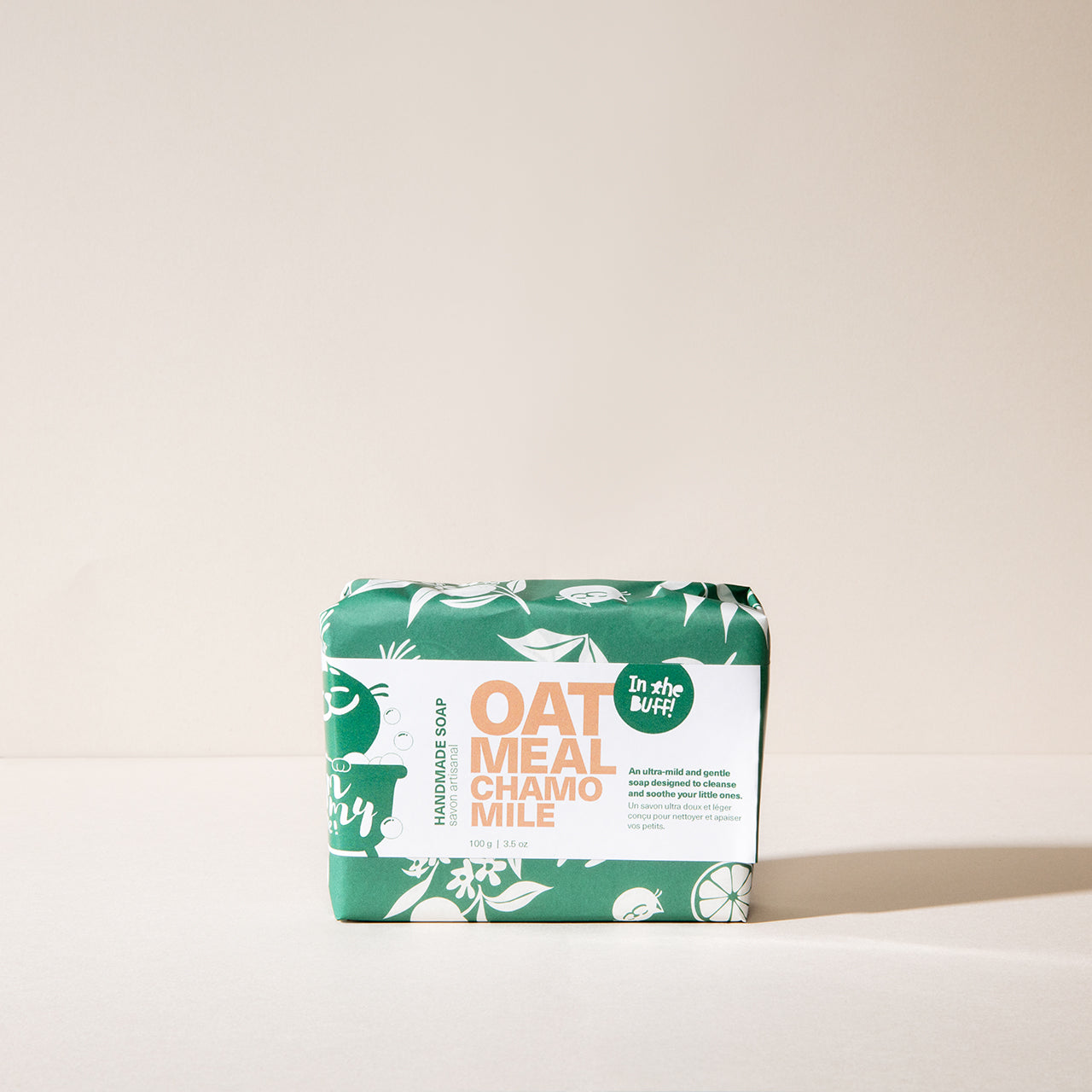 A bar of Oatmeal Chamomile soap wrapped in green packaging on a light background