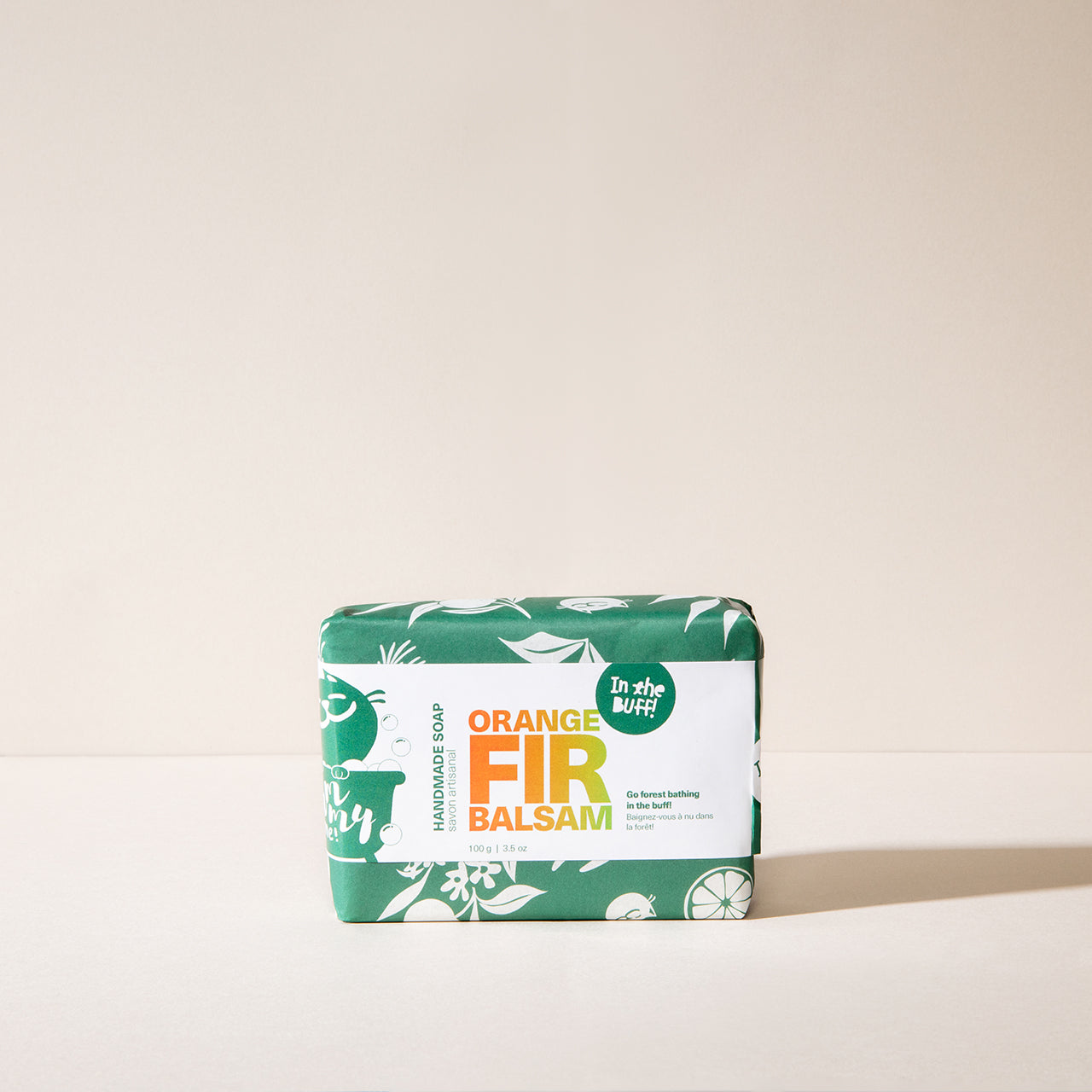 A bar of Orange Fir Balsam wrapped in green paper on a light background.