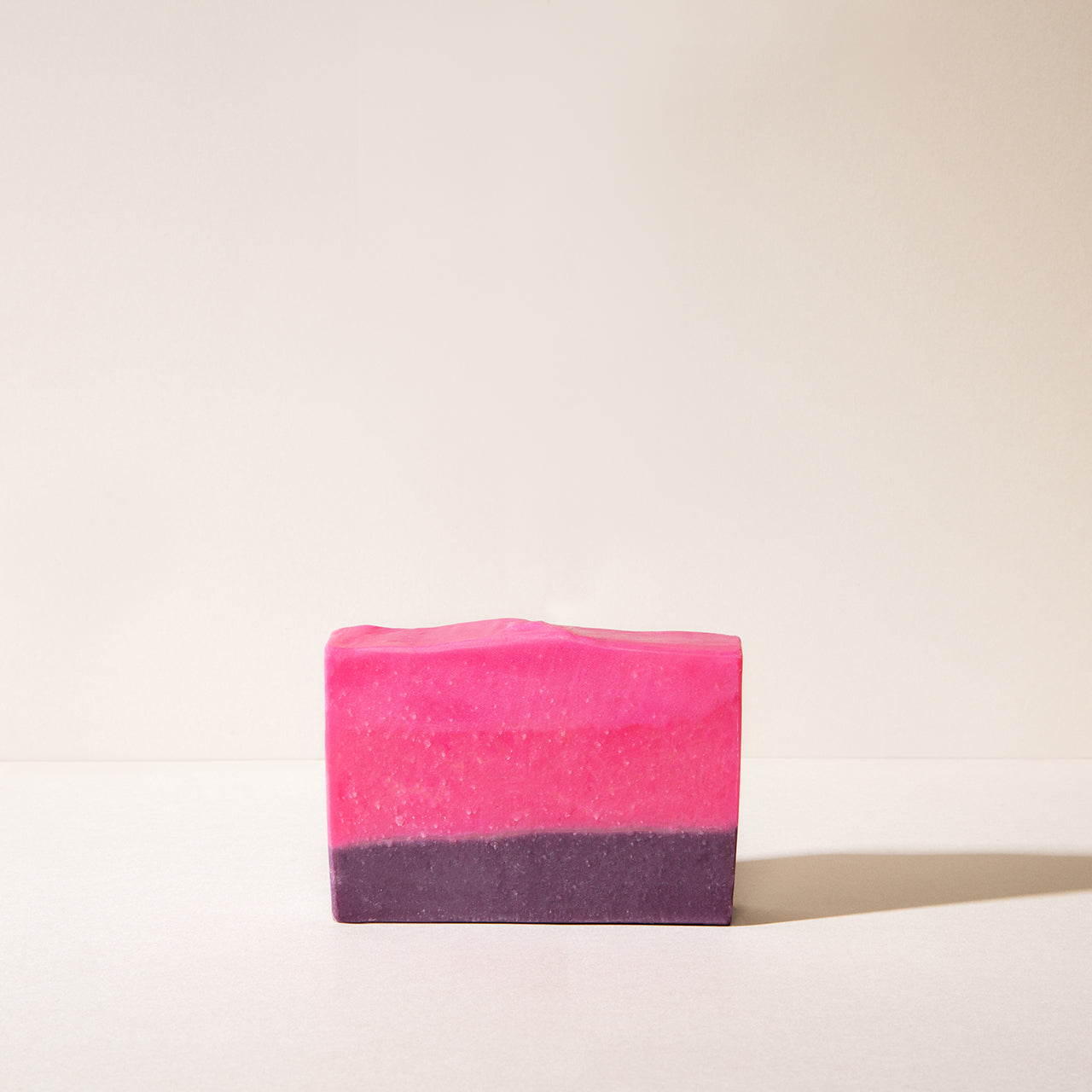 A pink with purple bar of Peony and Amberwood soap without it's packaging on a light background