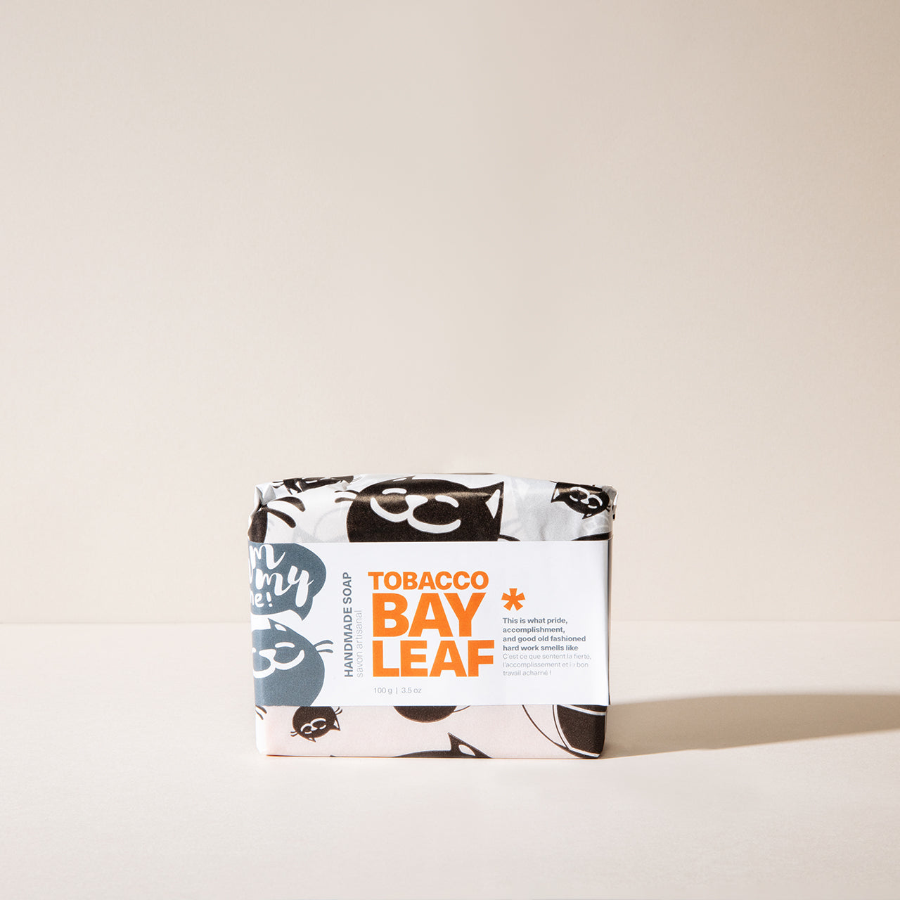 A bar of Tobacco and Bay Leaf soap with packaging on a light background