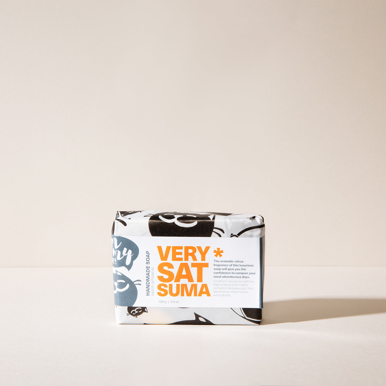 A bar of Very Satsuma Soap with wrapping paper on a light background.