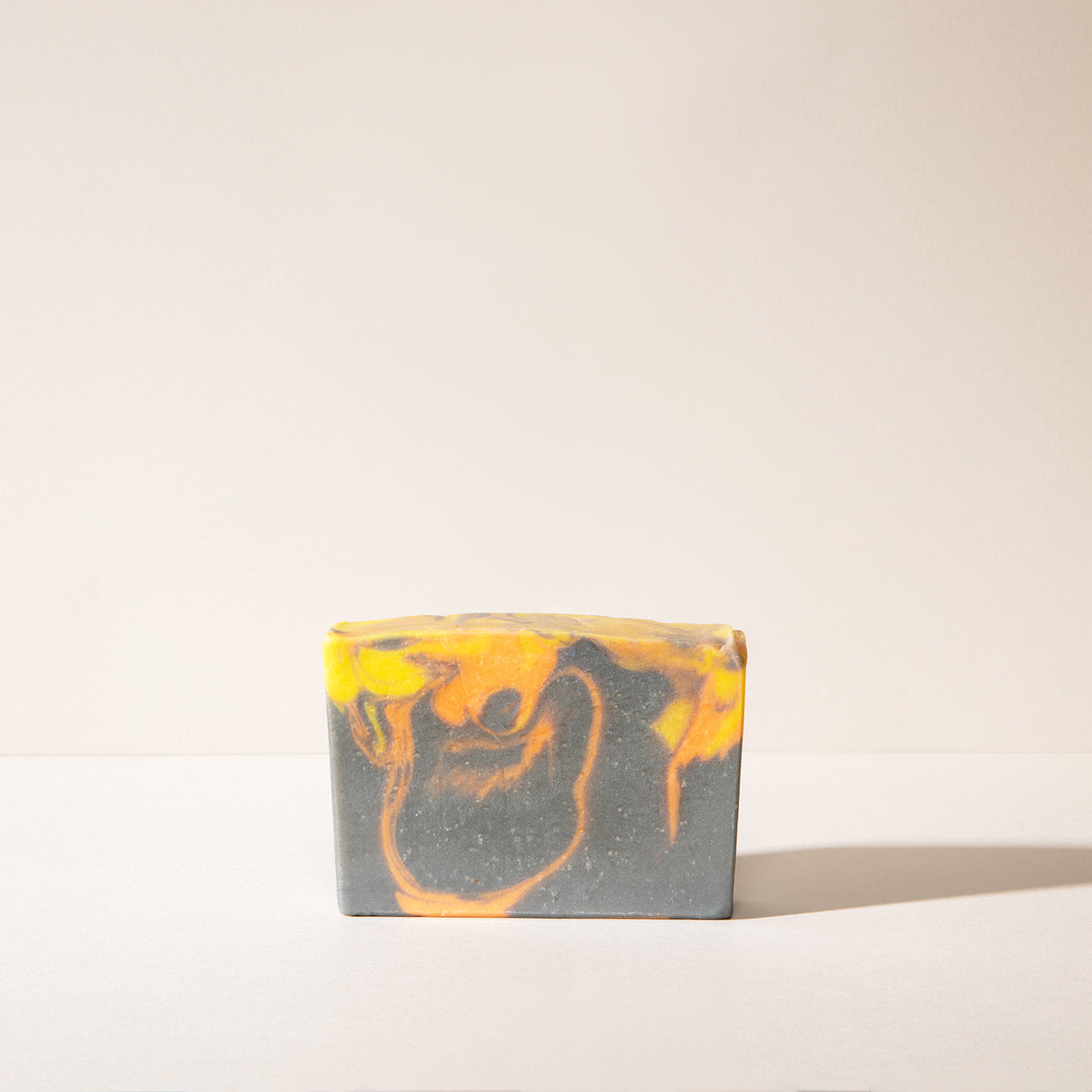 A mottled black and orange bar of Very Satsuma Soap without wrapping paper on a light background