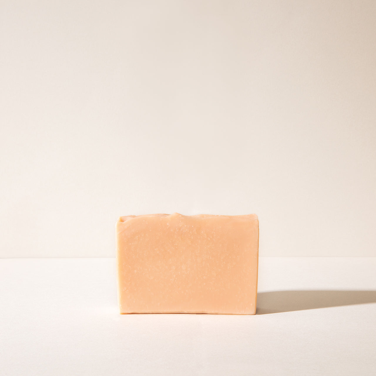 A yellow bar of White Grapefruit & Black Pepper soap without wrapping paper.